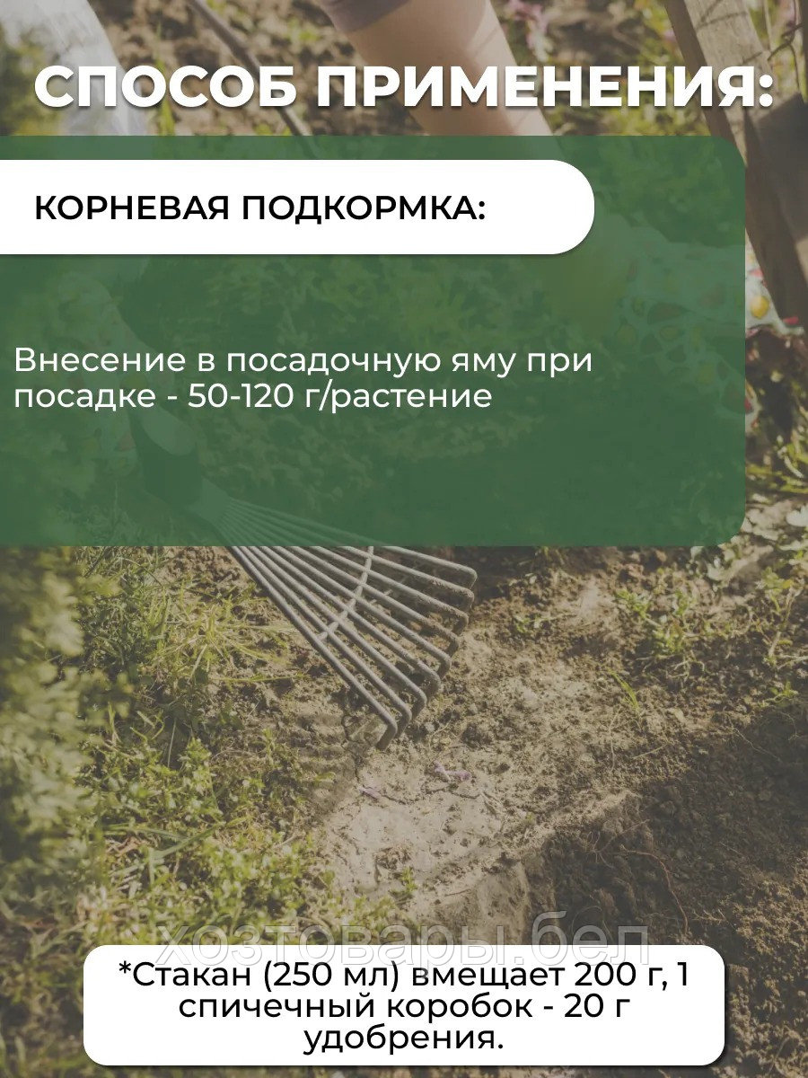 - плодовые деревья и кустарники: 15-30г на м2 с последующим рыхлением и поливом - подкормки;