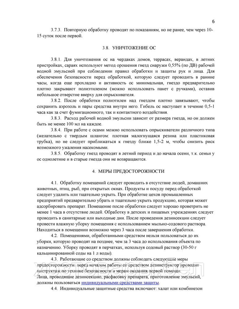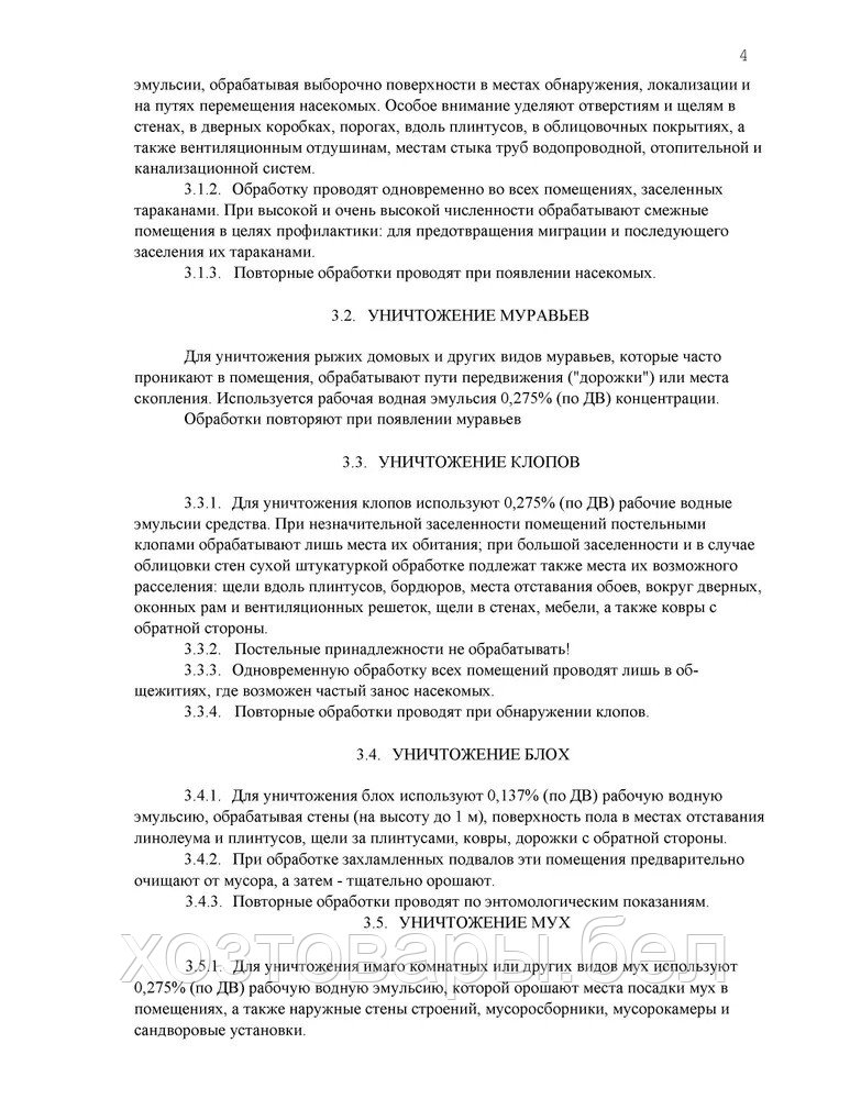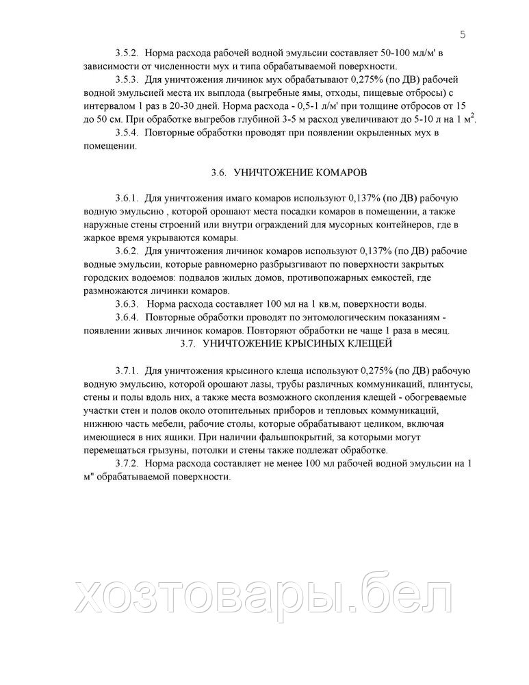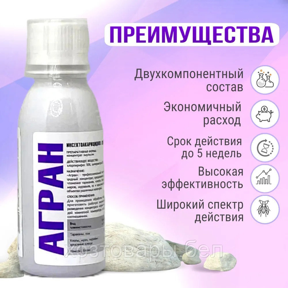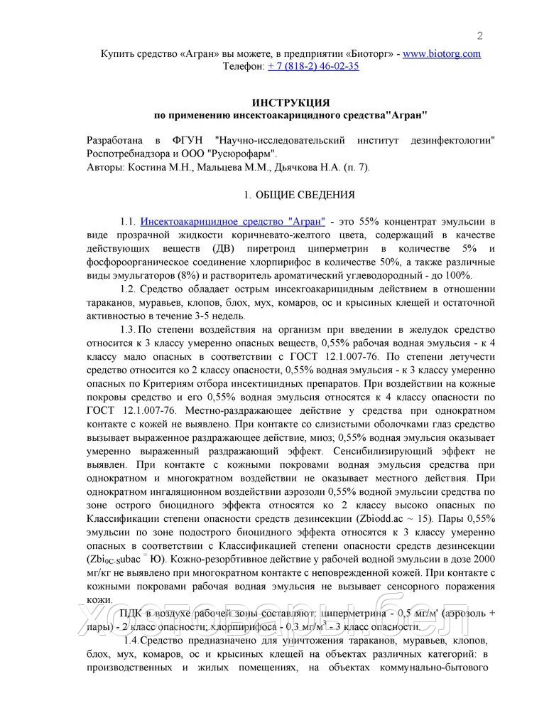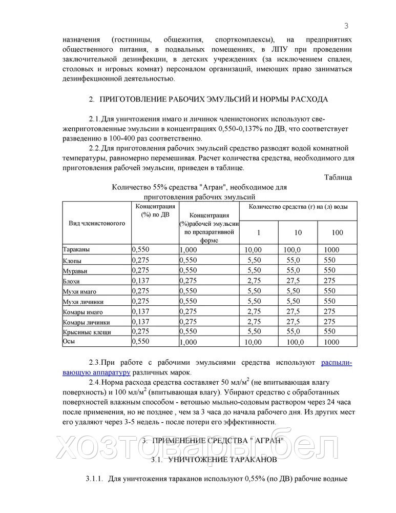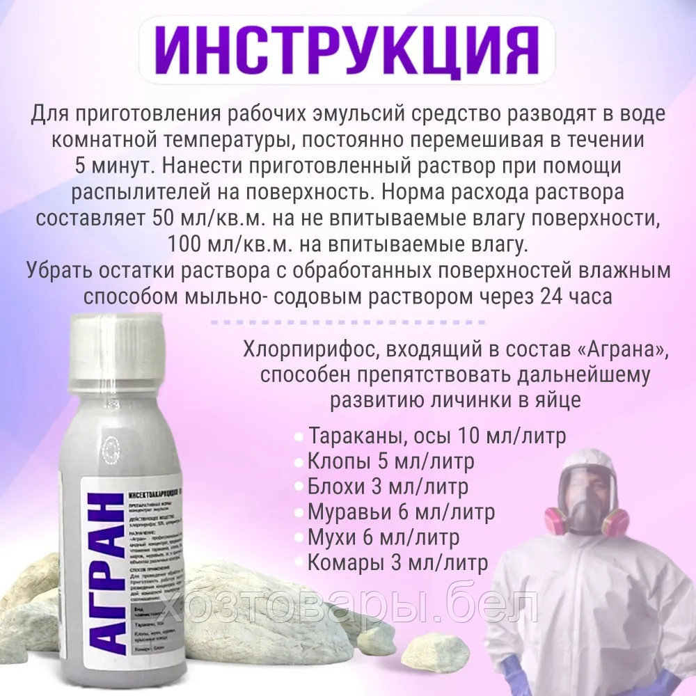 Профессиональный инсектоакарицидный концентрат «Агран» предназначен для уничтожения тараканов, клопов, блох, мух, комаров, муравьев, ос и крысиных клещей на объектах различных категорий, в том числе пищевых, лечебных, детских, коммунально-бытовых.Действующее вещество: хлорпирифос 50%; циперметрин 5%.Способ применения: Для проведения обработки необходимо приготовить рабочую эмульсию путем разведения концентрата «Агран» водой комнатной температуры. Наносить рабочую эмульсию при помощи любой распылительной аппаратуры в места обнаружения, локализации и перемещения членистоногих из расчета 100 мл/м кв на впитывающие поверхности, 50 мл/м кв – на невпитывающие. Убирают средство с обработанных рабочих поверхностей влажным способом не менее чем через 8 часов после обработки, но не позднее, чем за 3 часа до планируемого доступа людей в помещение.Тараканы, осы: 10 г. на 1 л. воды.Клопы, мухи, муравьи.