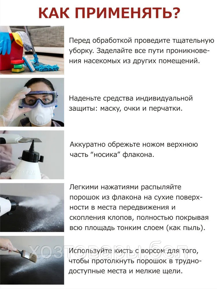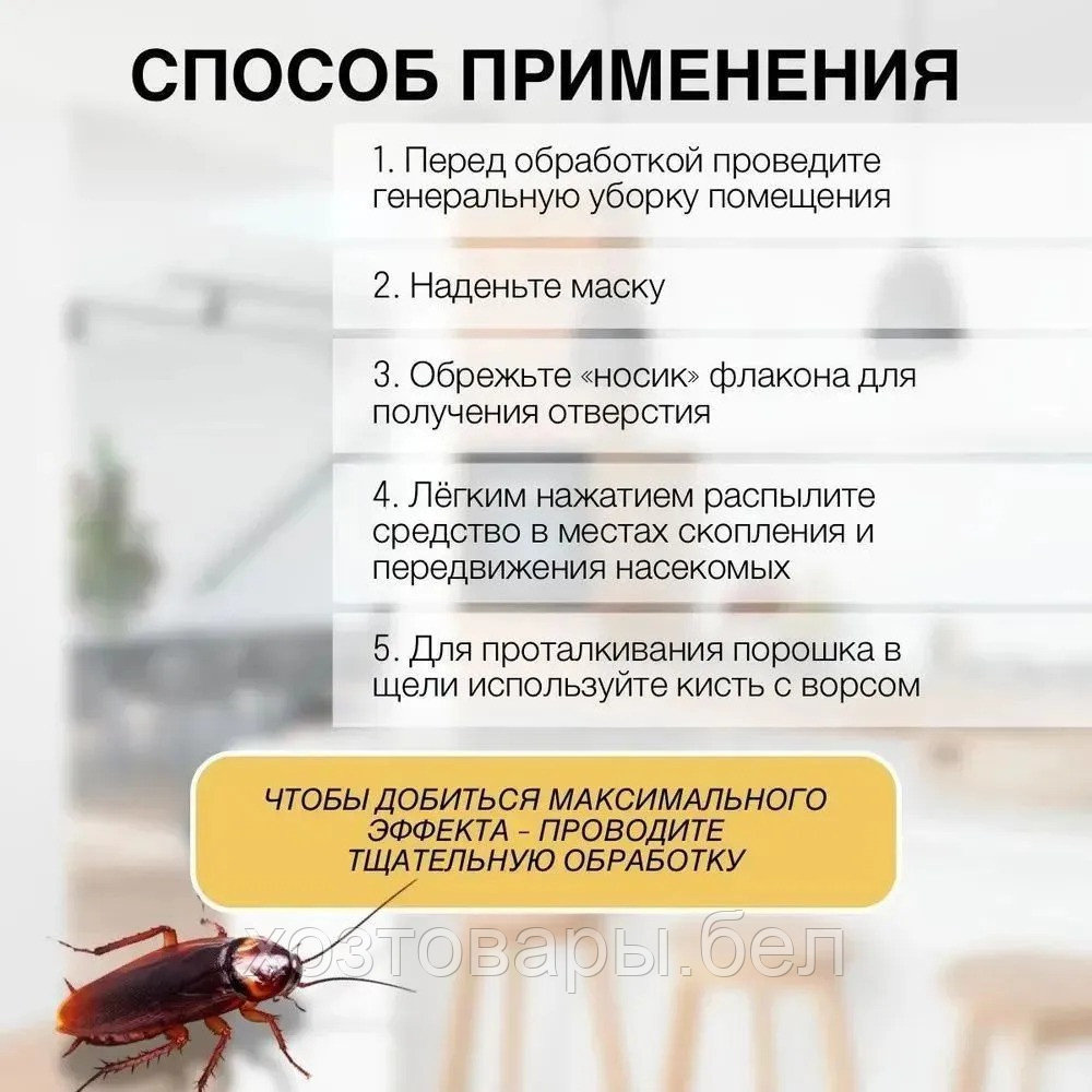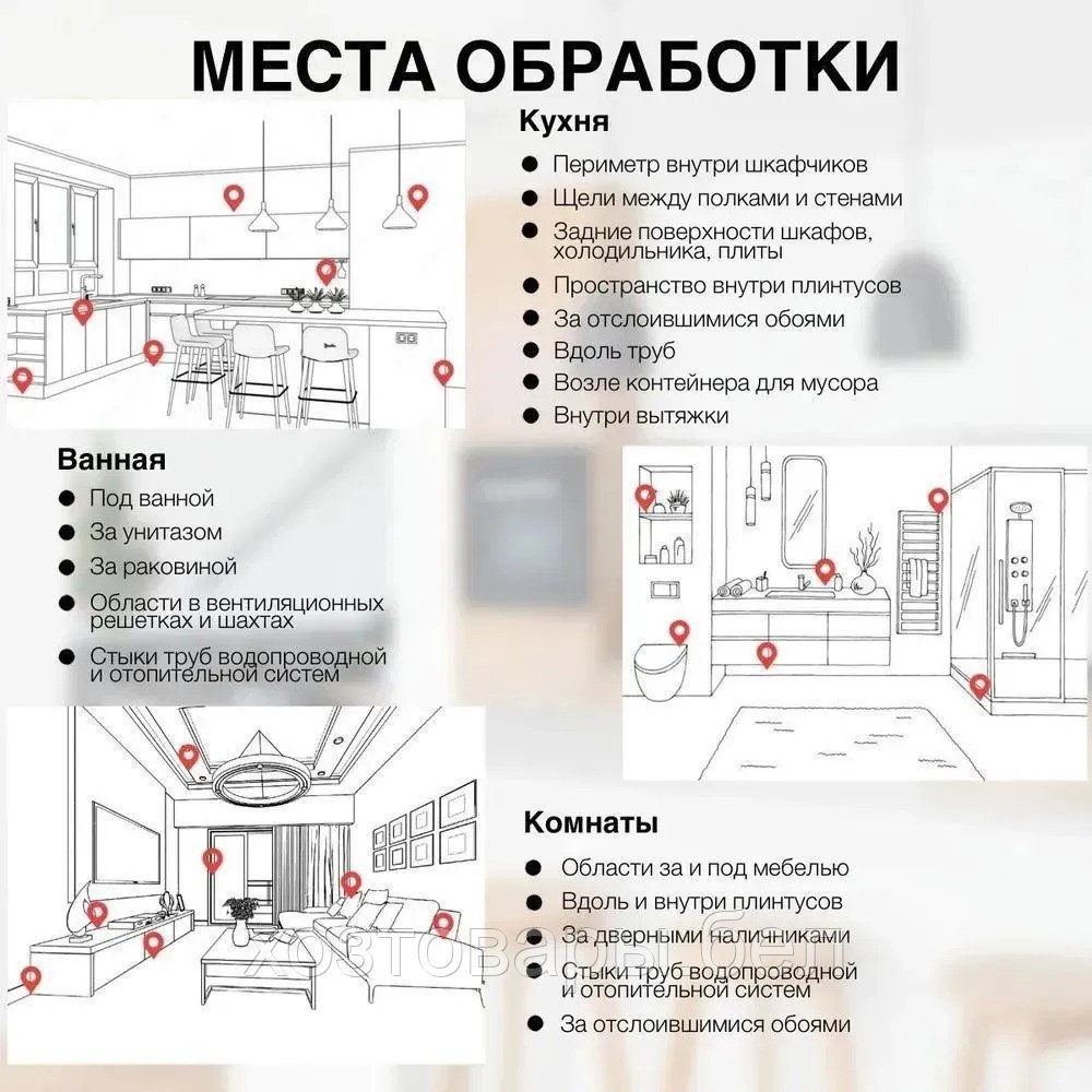 Назначение: Уничтожает тараканов, клопов, домашних и садовых муравьёв, блох, чешуйниц, пауков, и других ползающих насекомых. Рекомендовано использовать внутри и снаружи жилых и нежилых помещений, зданий и ближайших окрестностей, внутри и вокруг производств.