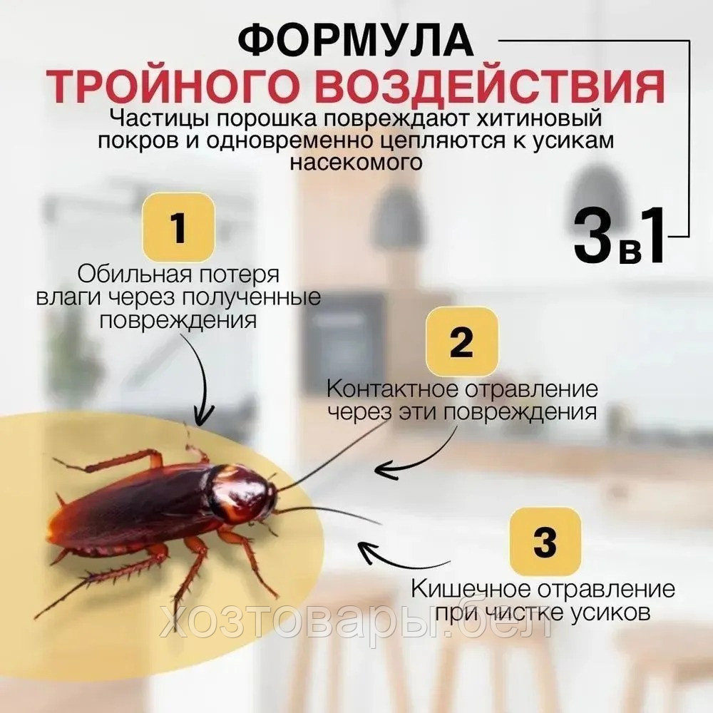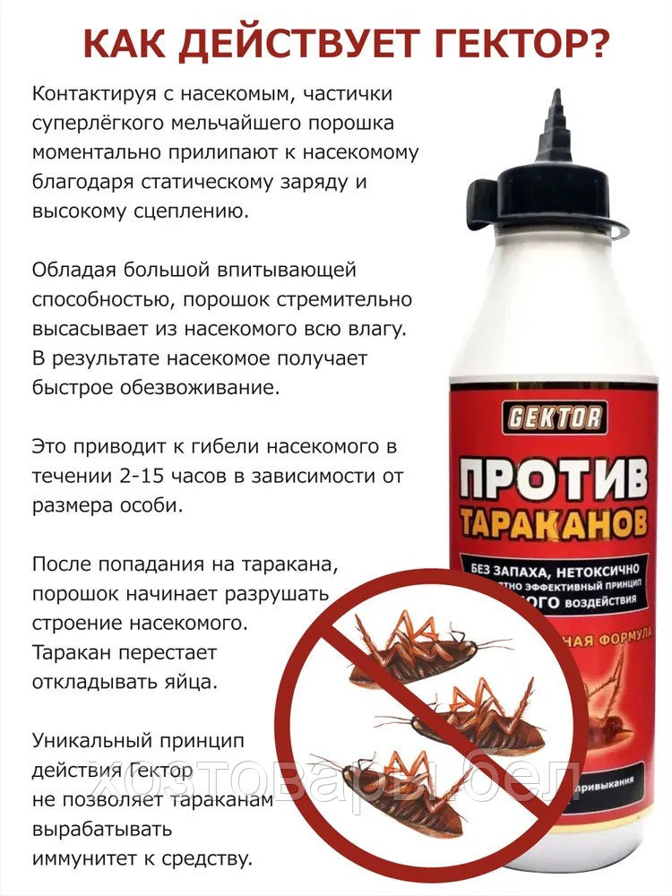 Размер частиц диатомита больше, чем у синтетического диоксида кремния, адсорбционные свойства несколько ниже, зато сильно выражены абразивные свойства. За счет этого порошок способен повреждать (сцарапывать) восковой слой кутикулы насекомых, приводя его к состоянию своего рода молекулярного сита (эффект Цахера), которое уже не способно эффективно удерживать воду в тканях – в итоге насекомое также погибает от обезвоживания.Эффективность препарата при борьбе с постельными клопами«GEKTOR» против постельных клопов» начинает действовать сразу же после попадания его частиц на поверхность тела паразита. При этом не важно, к какой конкретно части тела прилип порошок — к брюшку, голове или ногам. В любом случае начнется обезвоживание организма клопа, и разница будет лишь в скорости этого процесса.
