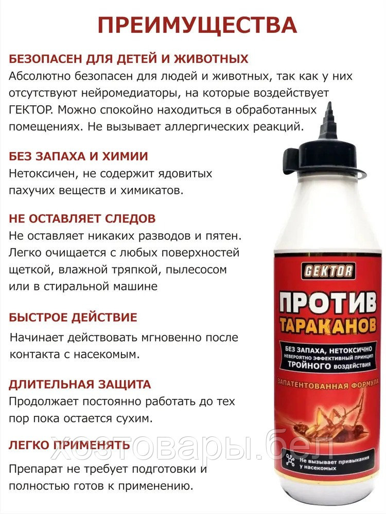 Важно то, что к обоим препаратам линейки «GEKTOR» у клопов не вырабатывается устойчивость, и эти средства будет эффективно уничтожать даже те популяции паразитов, которые резистентны к действию обычно применяемых химических инсектицидов (классических пиретроидов, карбаматов и некоторых фосфорорганических веществ, к которым нередко наблюдается перекрестная устойчивость).