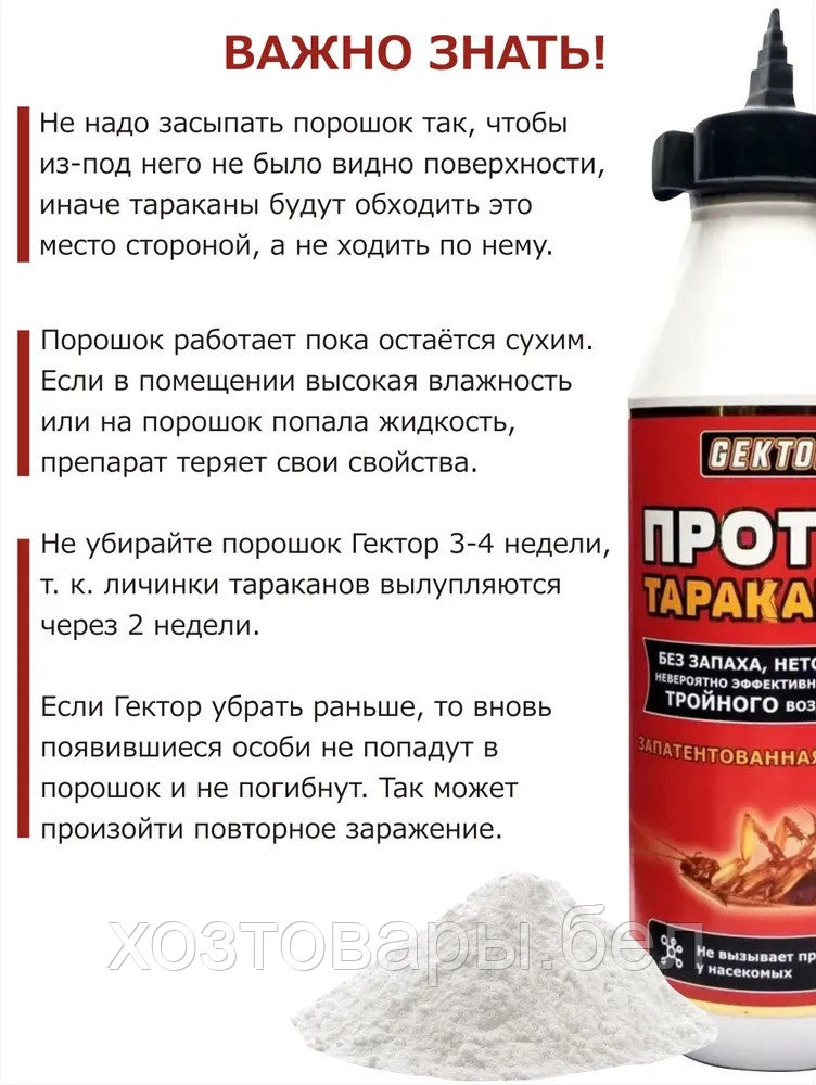 Таким образом, при попадании частиц препарата «GEKTOR» на тело клопа основное действие заключается в обезвоживании паразита. В зависимости от того, как много средства окажется на поверхности тела кровососа, он погибает в разные сроки — от нескольких часов до нескольких суток (в «Научно-исследовательском институте Дезинфектологии» в ходе экспериментов 100%-я смертность клопов наступала в течение суток).