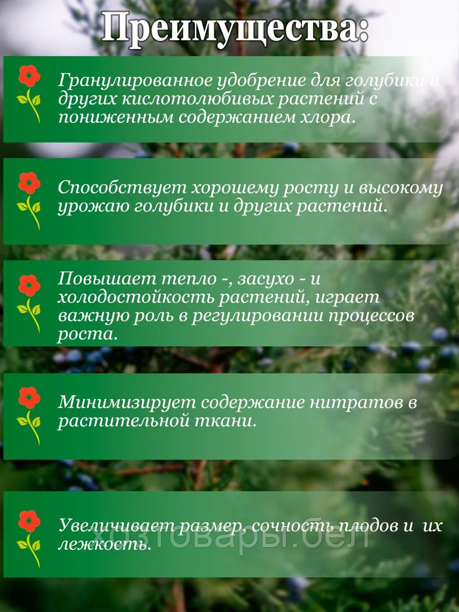 Специализированное гранулированное удобрение с пониженным содержанием хлоридов для голубики и других ацидофилов. Сбалансированный состав содержит питательные вещества необходимые для поддержания оптимального уровня кислотности почвы. Регулярное использование создает идеальные условия для развития растений. Калиевое содержимое обеспечит щедрый урожай плодов.Расход 1 кг на 50м2.